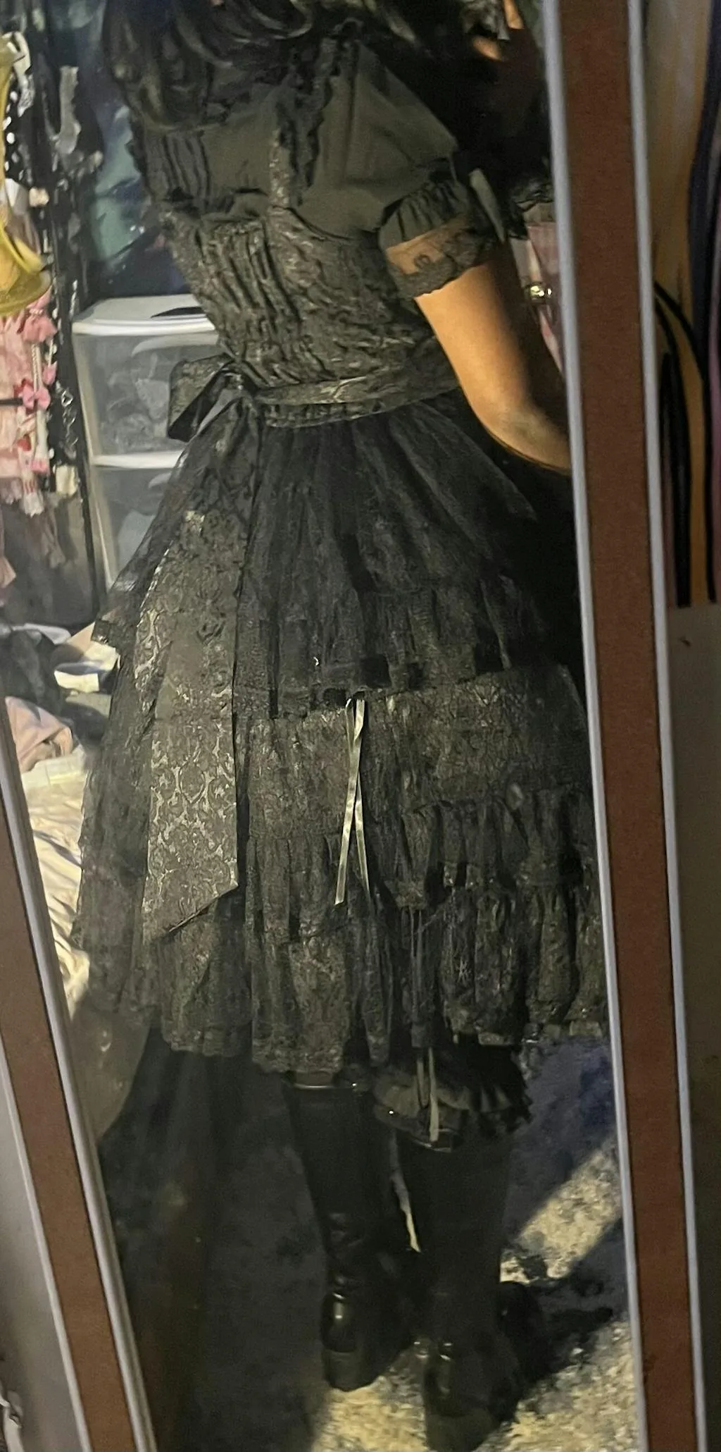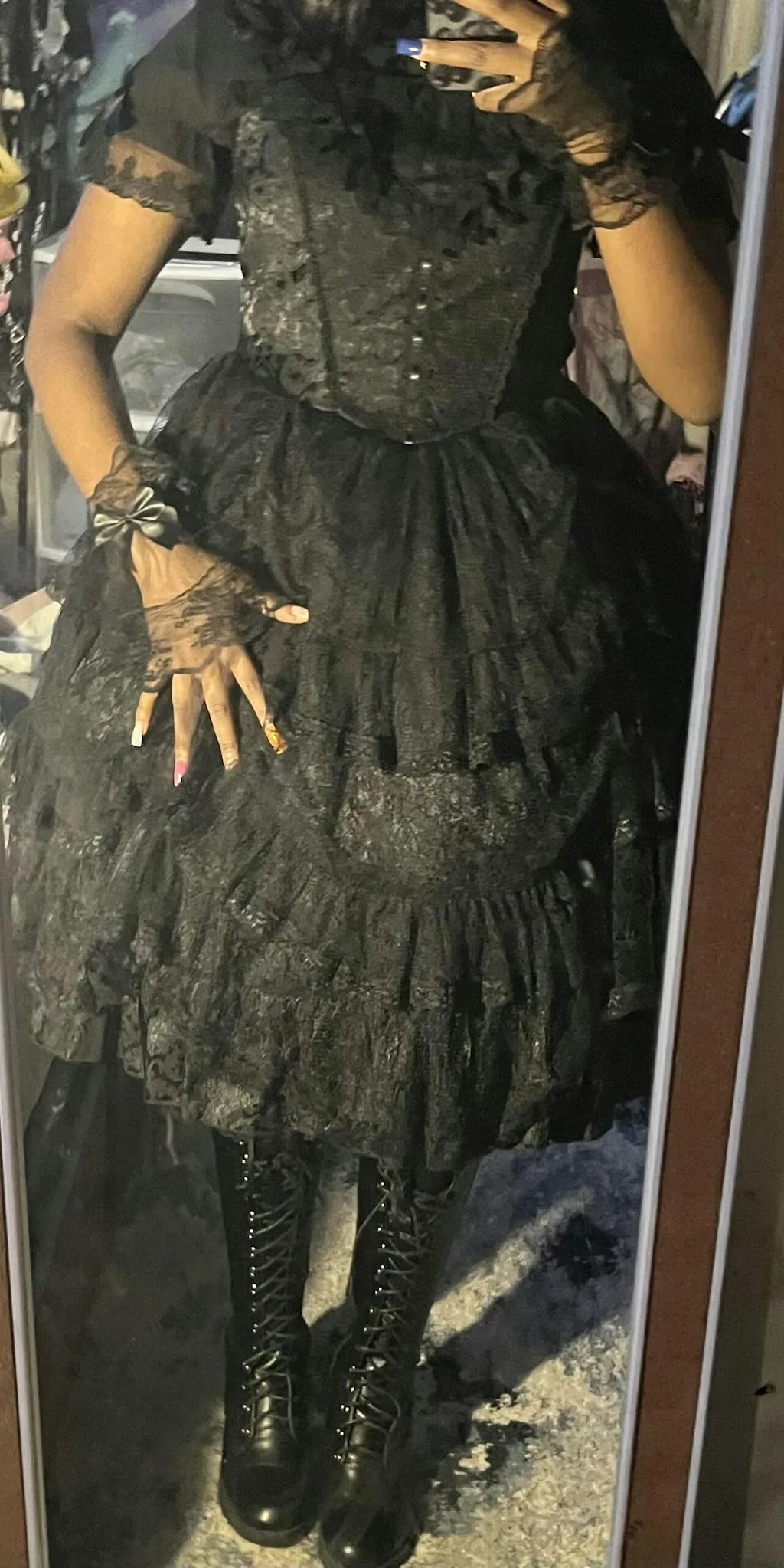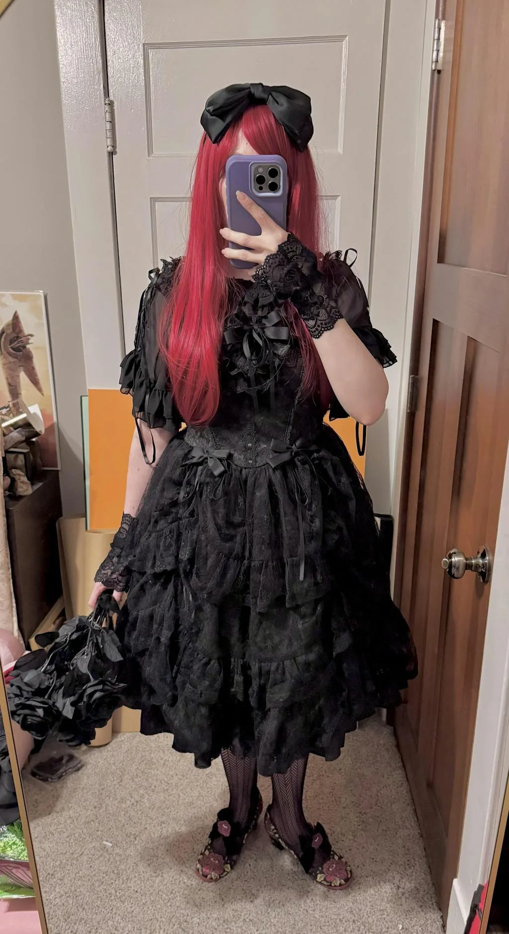 The dress and shirt both feature a nice amount of frills and ribbons, making the ensemble dark but also sweet and elegant, and there are some detachable bows you can pin on or not. The skirt also has channels which allow you to do a little bustling, which I prefer since it adds more volume and texture to the look. The only real complaint I have is that the JSK zipper is a bit sticky, especially at the waist (as zippers often are), which can require some effort to close. This wouldn’t be an issue except you don’t want to accidentally pull too hard and catch your chiffon top in the zipper! I’ve managed to pull the JSK off without zipping it all the way down, but it’s not easy--I will just have to be mindful to avoid having my zipper eat my shirt.