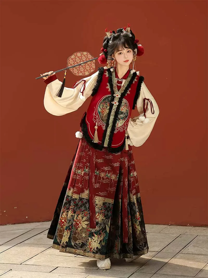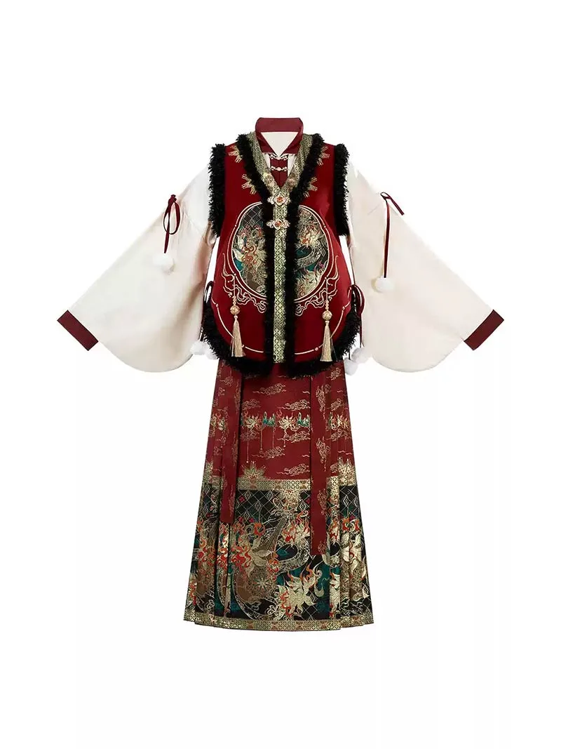 Perfect for women who want to celebrate with elegance, this hanfu female set is suitable for New Year festivities, cultural events, or fashionable daily wear. The pipa sleeve design adds a flowing, romantic detail, while the brocade skirt creates a sense of tradition and grandeur. The vest top completes the outfit with layering that emphasizes versatility and charm. This piece goes beyond seasonal fashion—it represents confidence, cultural pride, and timeless style, making it a wardrobe essential for women seeking both beauty and tradition.