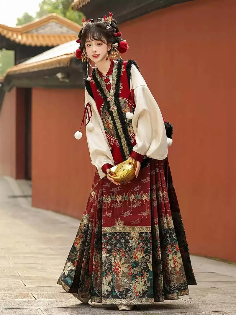 This modern hanfu female outfit is designed for the festive New Year season, combining traditional elegance with a refined modern touch. Featuring graceful pipa sleeves, a brocade mamian skirt, and a layered vest top, the set presents a rich blend of Chinese heritage and contemporary fashion. The woven golden patterns enhance its festive charm, while the thoughtful tailoring ensures comfort and sophistication for autumn gatherings and special occasions. This ensemble captures the joy of celebration while maintaining a stylish balance of culture and modernity.